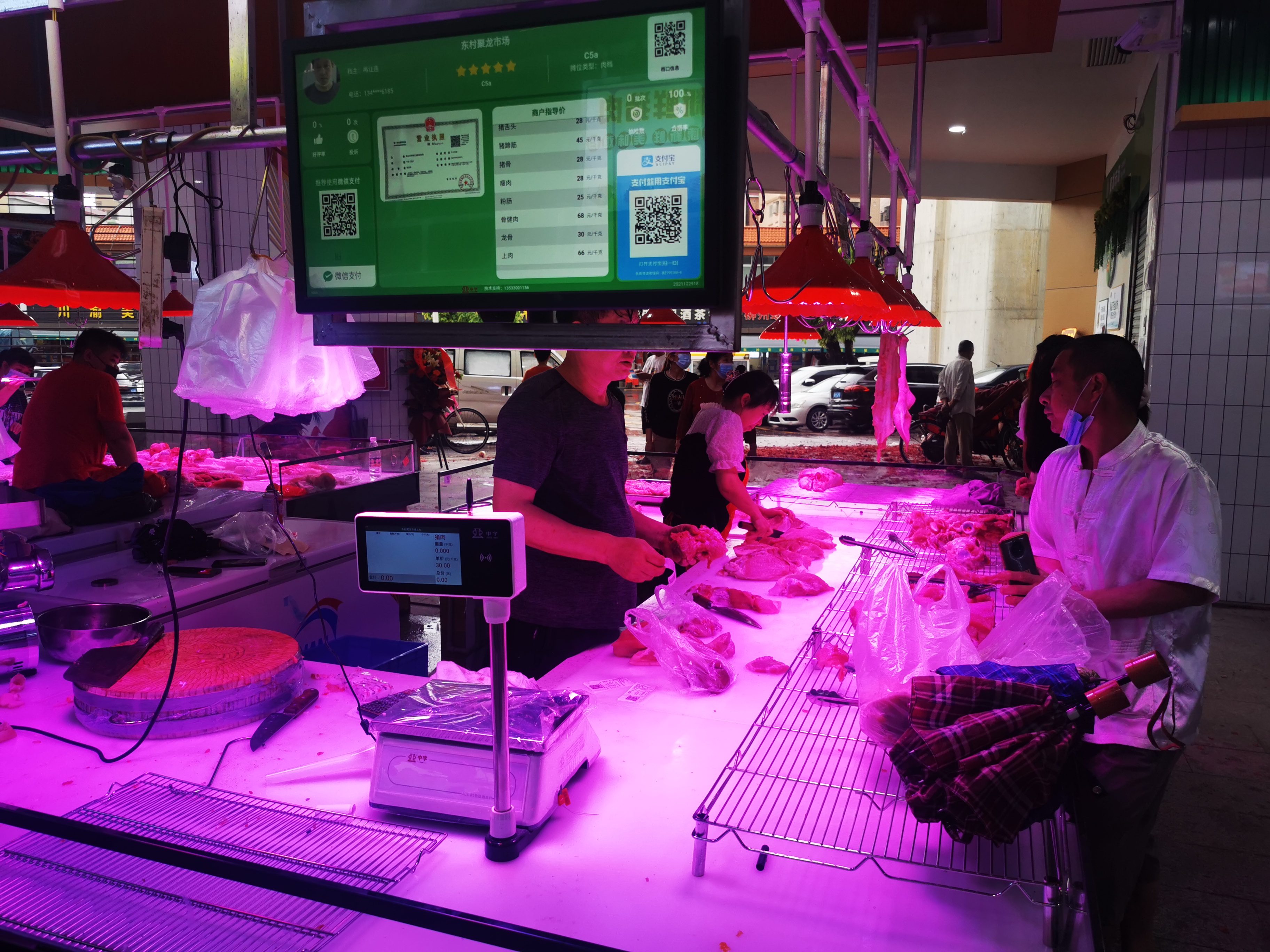 每个经营户摊位上方都统一配置了商户信息屏,由网络连接到服务器后台,屏幕上可以显示出商户的营业执照、产品价格、检测报告、商户信用、电子支付码等内容,同时还能与消费者形成互动,消费者可以实时对商户信用进行评价。