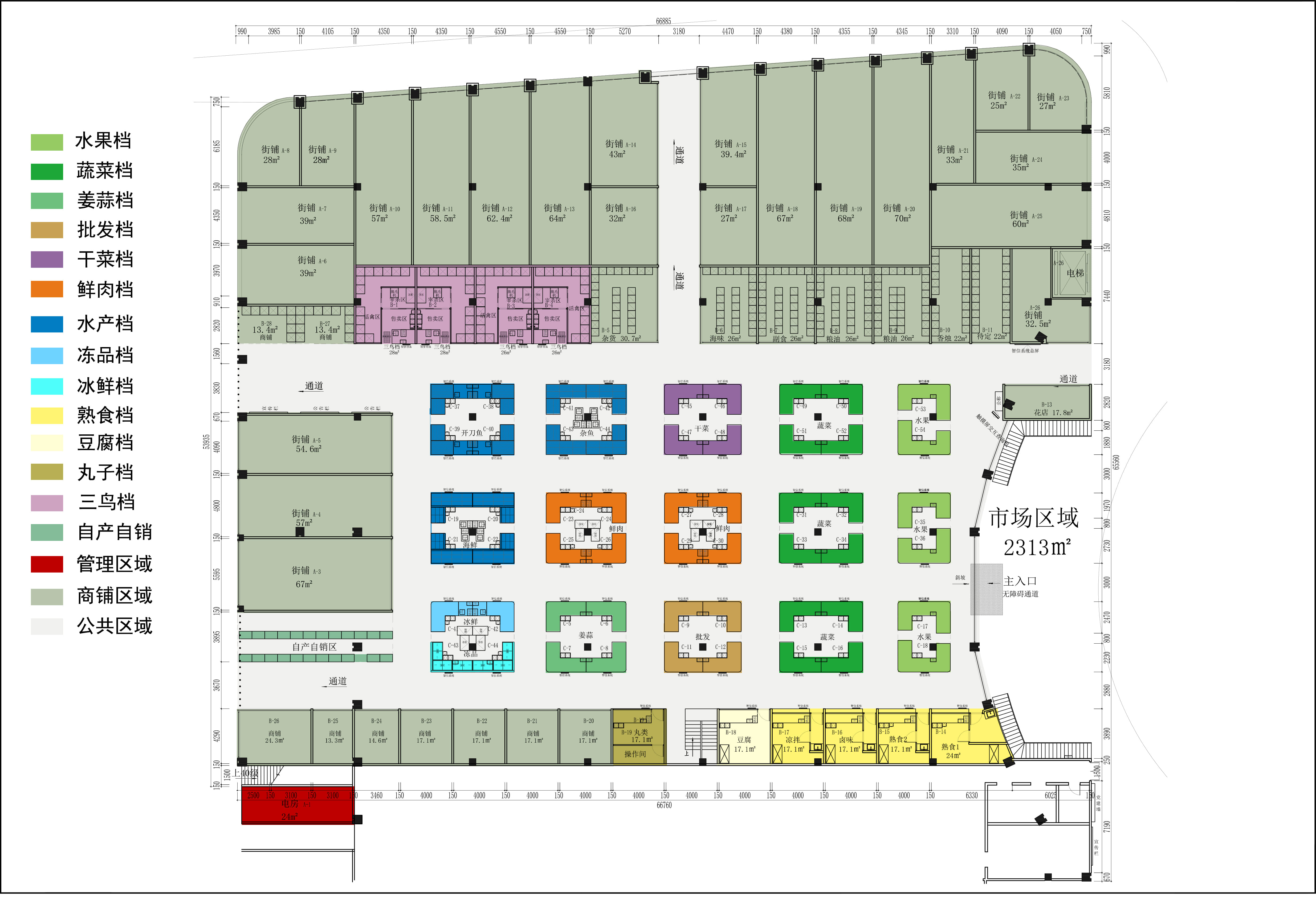 市场经营面积2000余平米,共57个摊位,包含蔬菜、海鲜、猪肉、粮油、生活配套等15大类。市场环境优美、设施完善、位置优越,