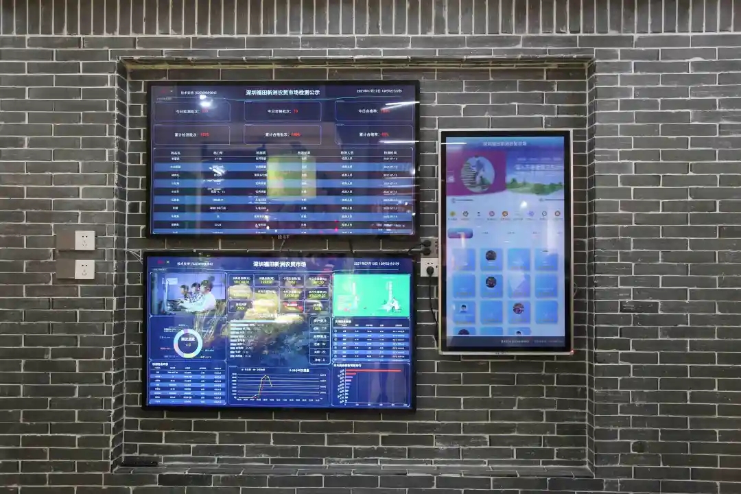 以电子屏互动体验的形式,动态化展示“数字检测室、预约进场、交易结算、防疫”等内容,实现数据可视化。